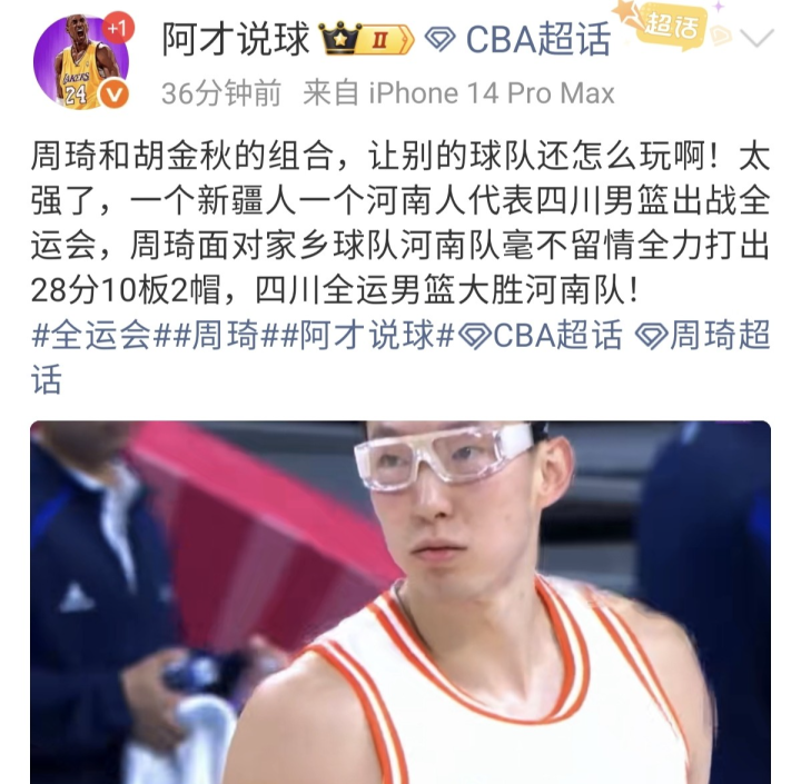 新疆盛名体育博主“阿才说球”发博暗意:“周琦和胡金秋的组合,让别的球队还怎么玩啊!太强了,一个新疆东谈主一个河南东谈主代表四川男篮出战全运会,周琦濒临家乡球队河南队绝不饶恕全力打出28分10板2帽,四川全运男篮大捷河南队! ”