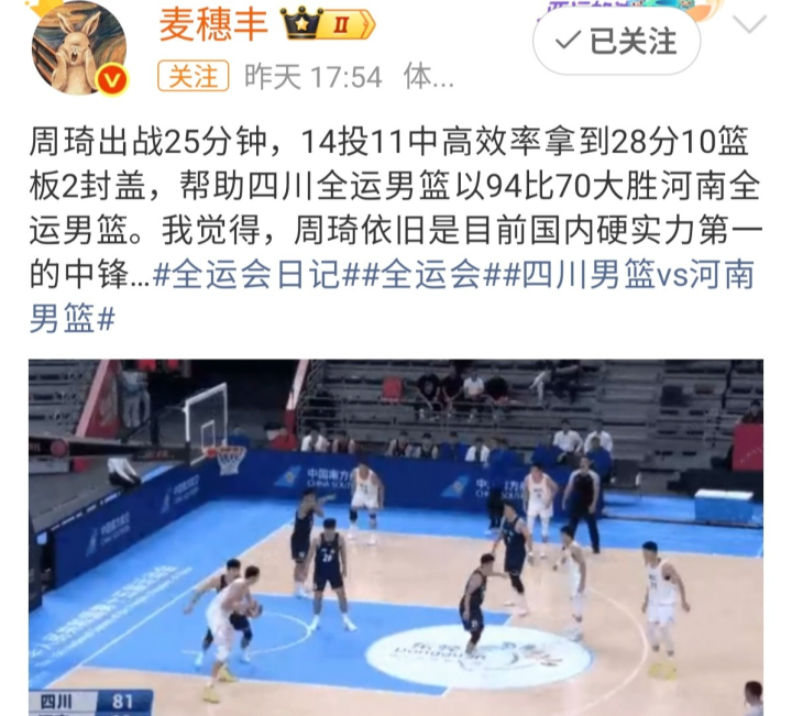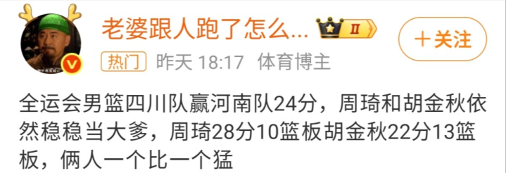 这位媒体东谈主发博暗意:“全运会男篮四川队赢河南队24分,周琦和胡金秋还是稳自如大爹,周琦28分10篮板胡金秋22分13篮板,俩东谈主一个比一个猛!”