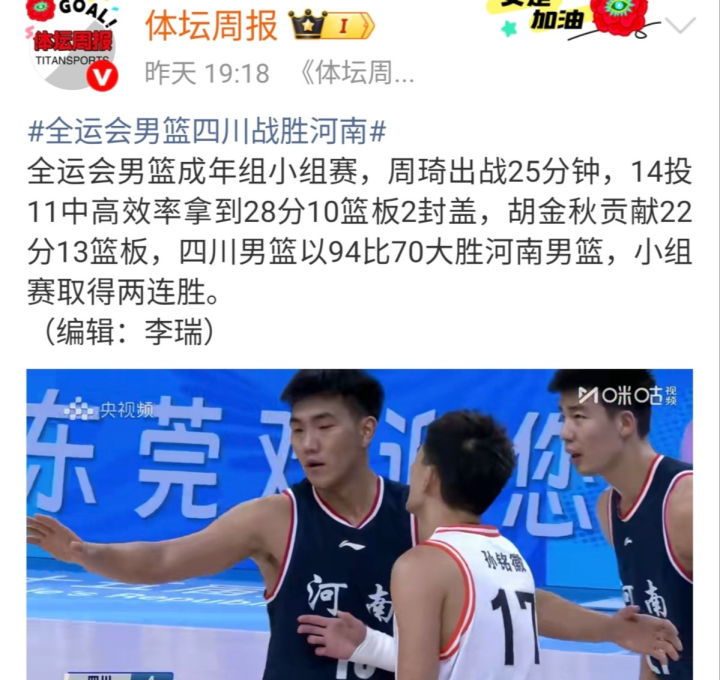 《体坛周报》发文暗意:“全运会男篮成年组小组赛,周琦出战25分钟,14投11中高恶果拿到28分10篮板2封盖,胡金秋孝敬22 分13篮板,四川男篮以94比70大捷河南男篮,小组赛获取两连胜。 ”