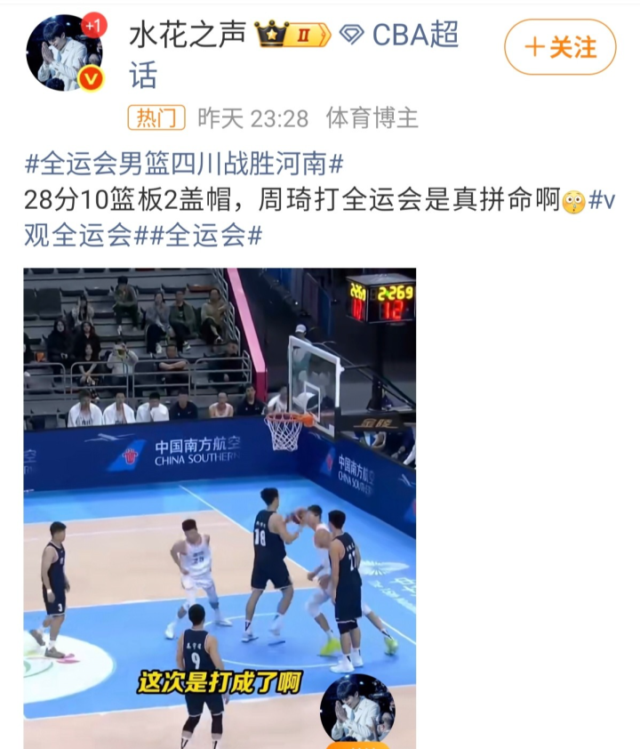 媒体东谈主“水花之声”发博暗意:“28分10篮板2盖帽,周琦打全运会是真拚命啊!”