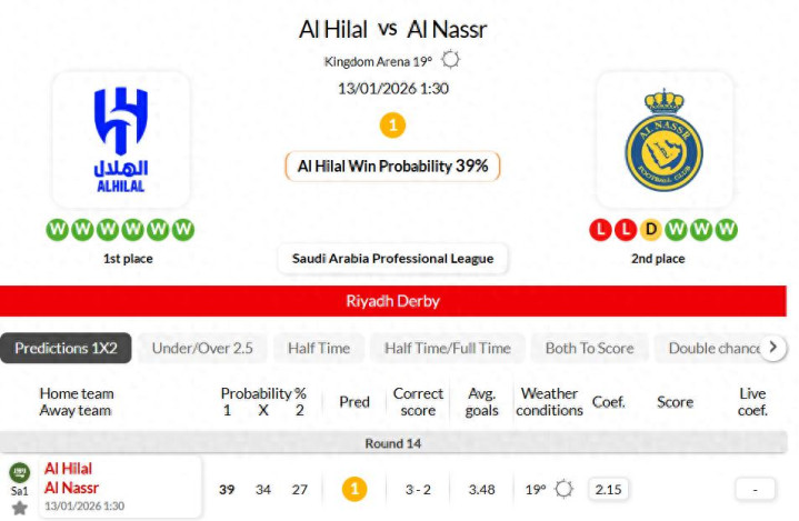 利雅得胜仗在最近13场沙特联中保抓11场不败