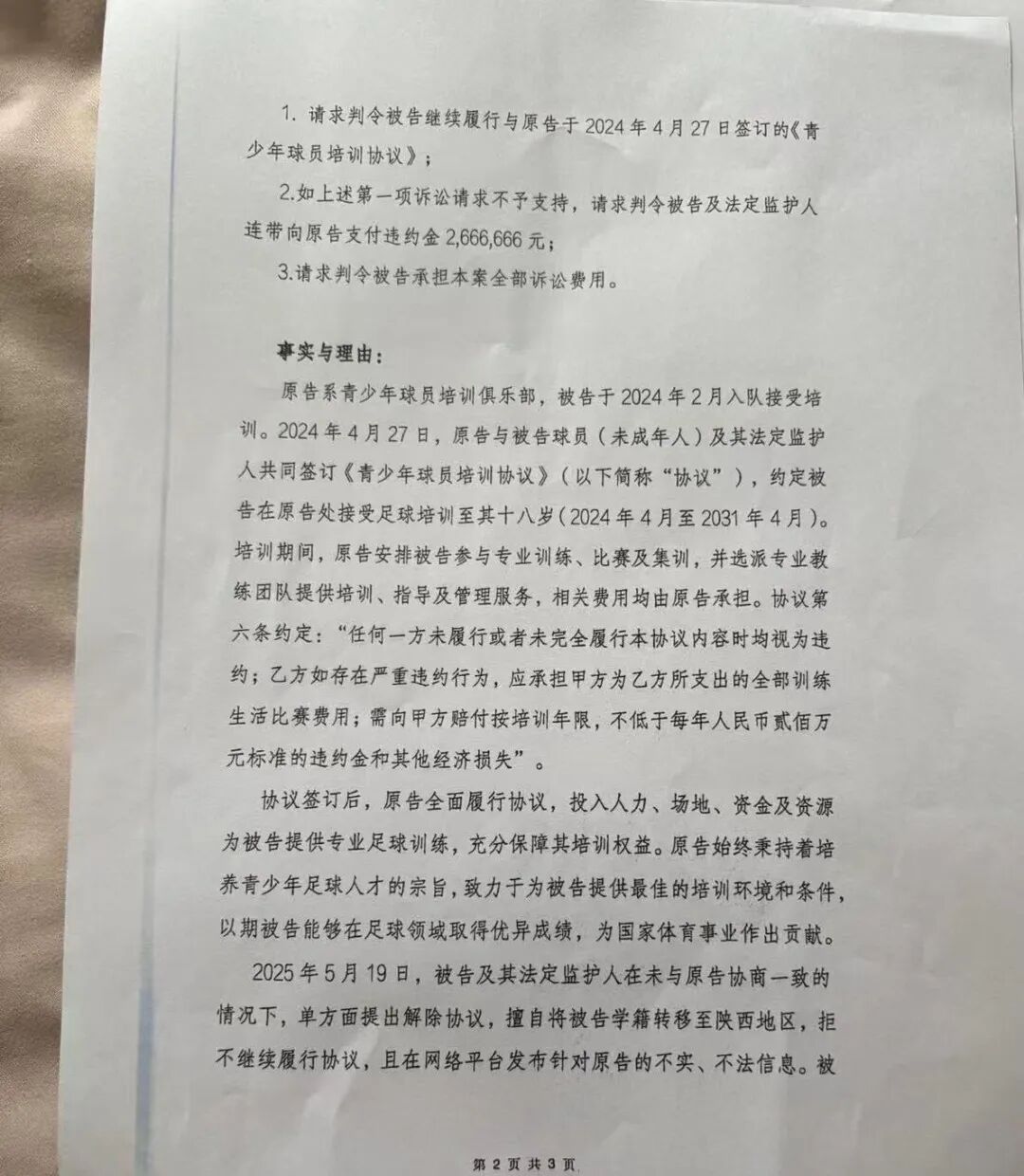 本年12岁的张卓毅,是又名签约青训球员,2024年4月27日,其家长与嗨球青训(以下简称嗨球)坚硬《青少年球员培训公约》,其中商定,嗨球免费培养,张卓毅要在嗨球踢到18岁。自本岁首以来,张卓毅家长与嗨球屡次协商解约未果。而后,张母在收罗上“控诉”嗨球索求“18万元天价背信金”。之后,嗨球拿起民事诉讼索赔266万余元。