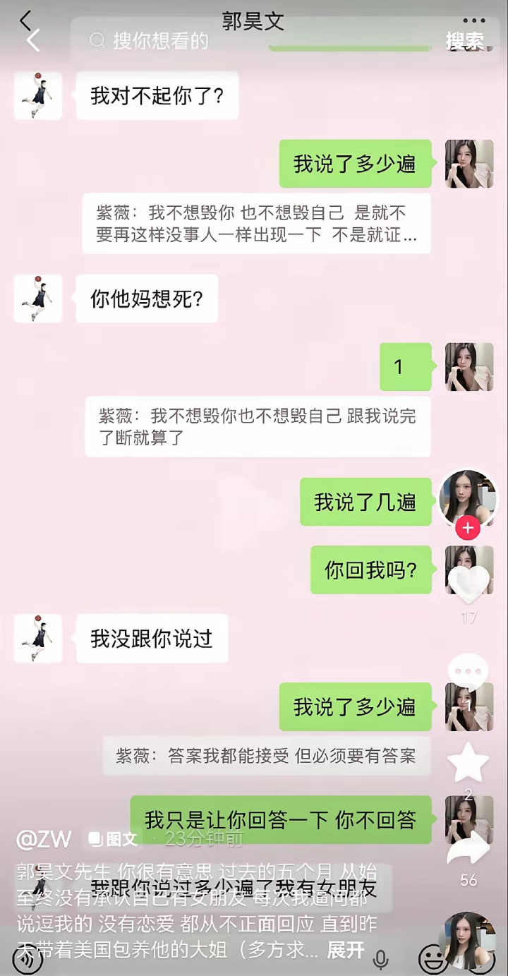 可谁能猜度,3月11号附近,一个网名叫“ZW”的女生陡然发声,平直晒出了她和郭昊文的多组聊天纪录。