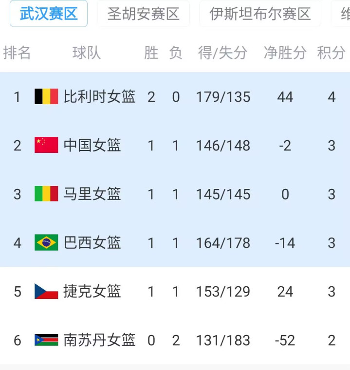 为止这一场比赛后,女篮所处的A组最新积分风光也出来了,2战全胜的比利时高居榜首,中国队、马里、巴西、捷克王人是1胜1负积3分,分列第2-第5,中国队净胜分-2,凭借上一轮打败马里的上风以及本轮捷克爆冷输球,名次不降反升来到第二。